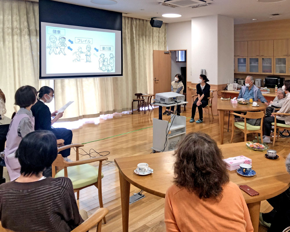 今年(令和7年度)は新しい取り組みとして、施設の作業療法士2名が「介護予防」をテーマに勉強会を行いました。参加者は「自分の健康状態をチェックするいい機会になりました」と仰ってくださいました。その他、職員による楽器演奏で一緒に音楽を楽しんだり、手先を使った作品づくり、食事レクリエーションなど、毎月、参加者と一緒に様々な取り組みを行っています。