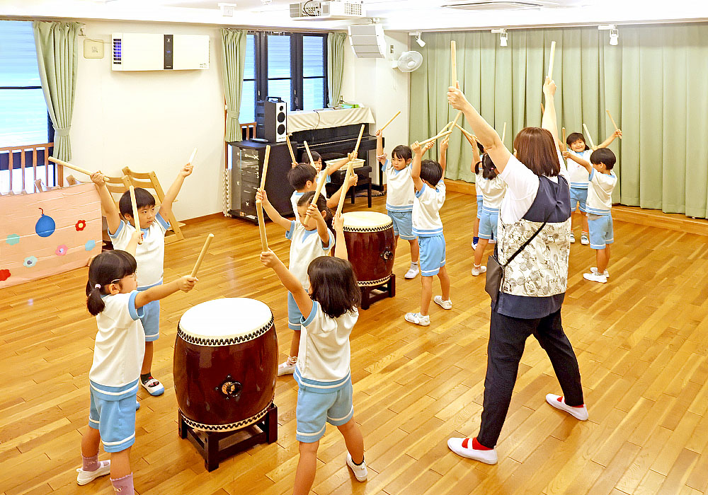 2025年6月1日で開園12年目を迎えた中之島ちどり保育園です。開園当初より地域の大きなお祭り「天神祭り」にちなんで、5歳児が和太鼓に取り組んでいます。