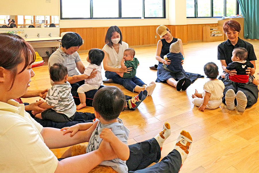 月齢の近い0歳児と一緒にふれあい遊びを楽しむ、保育士の子どもへのかかわり等を通して、育児不安を軽減する、お子さんへの関わりに気づき育児に生かしてもらうなど親子のふれあいの一助とすることを目的としています。