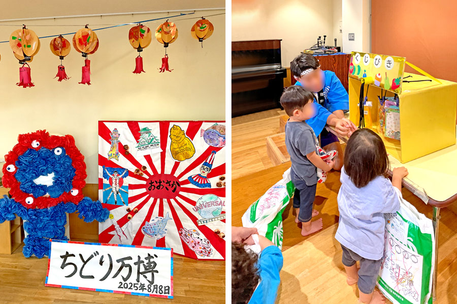 今年の夏祭りのテーマは「ちどり万博2025」ということで、出店のお面やフォトスポットなど、大阪にちなんだものを準備しました!