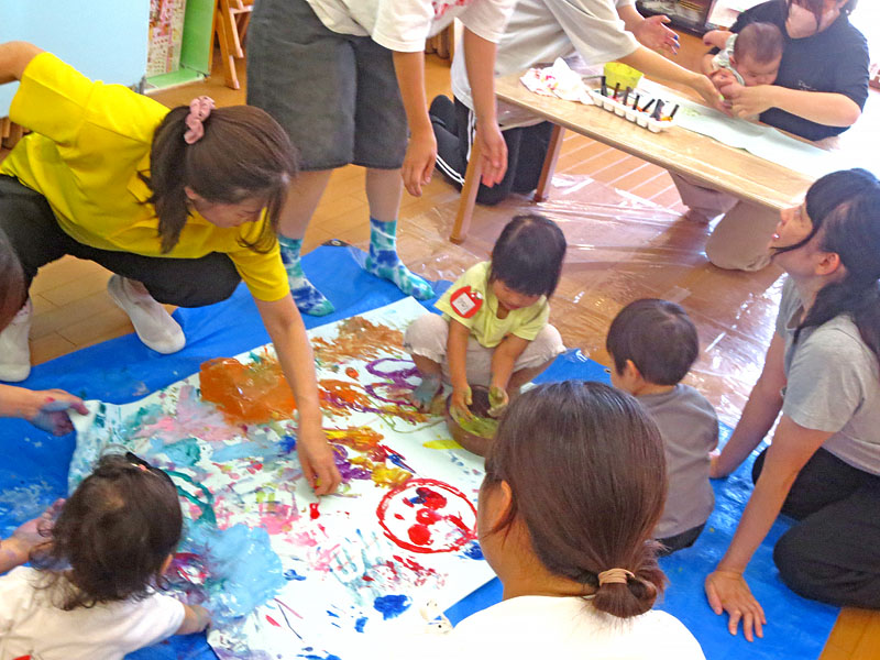 最後は大きな模造紙にみんなでお絵描きをしました。普段体験することがないダイナミックなお絵描きに、子どもたちだけでなくお母さんたちも夢中になって楽しんでいました。