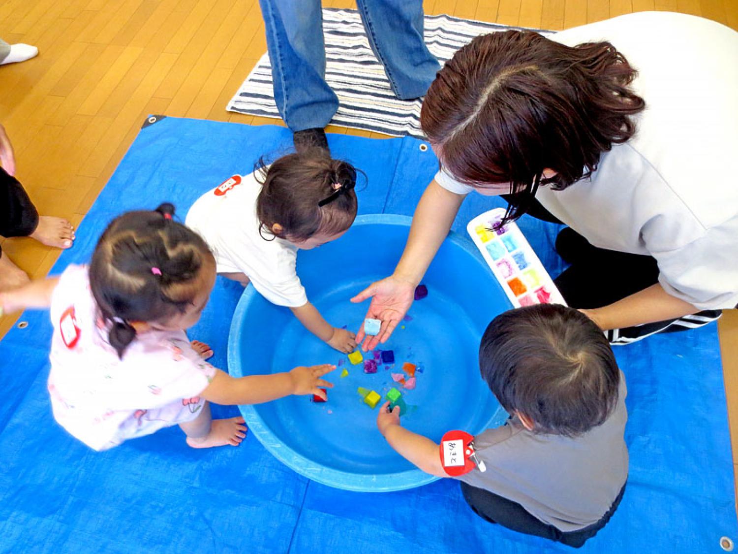色水を凍らせた色氷を見せると興味津々の子どもたち。