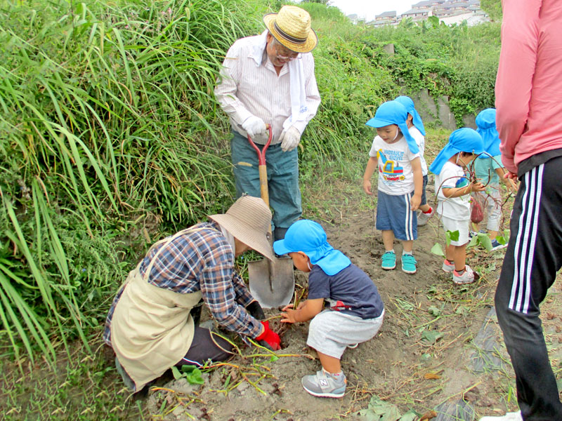 土の中から大きなおいもが顔を出すと、地域の方と一緒に力を合わせて「うんとこしょどっこいしょ」「うわぁ!おおきい!」「いっぱいあった!」と大喜びの子ども達でした。
