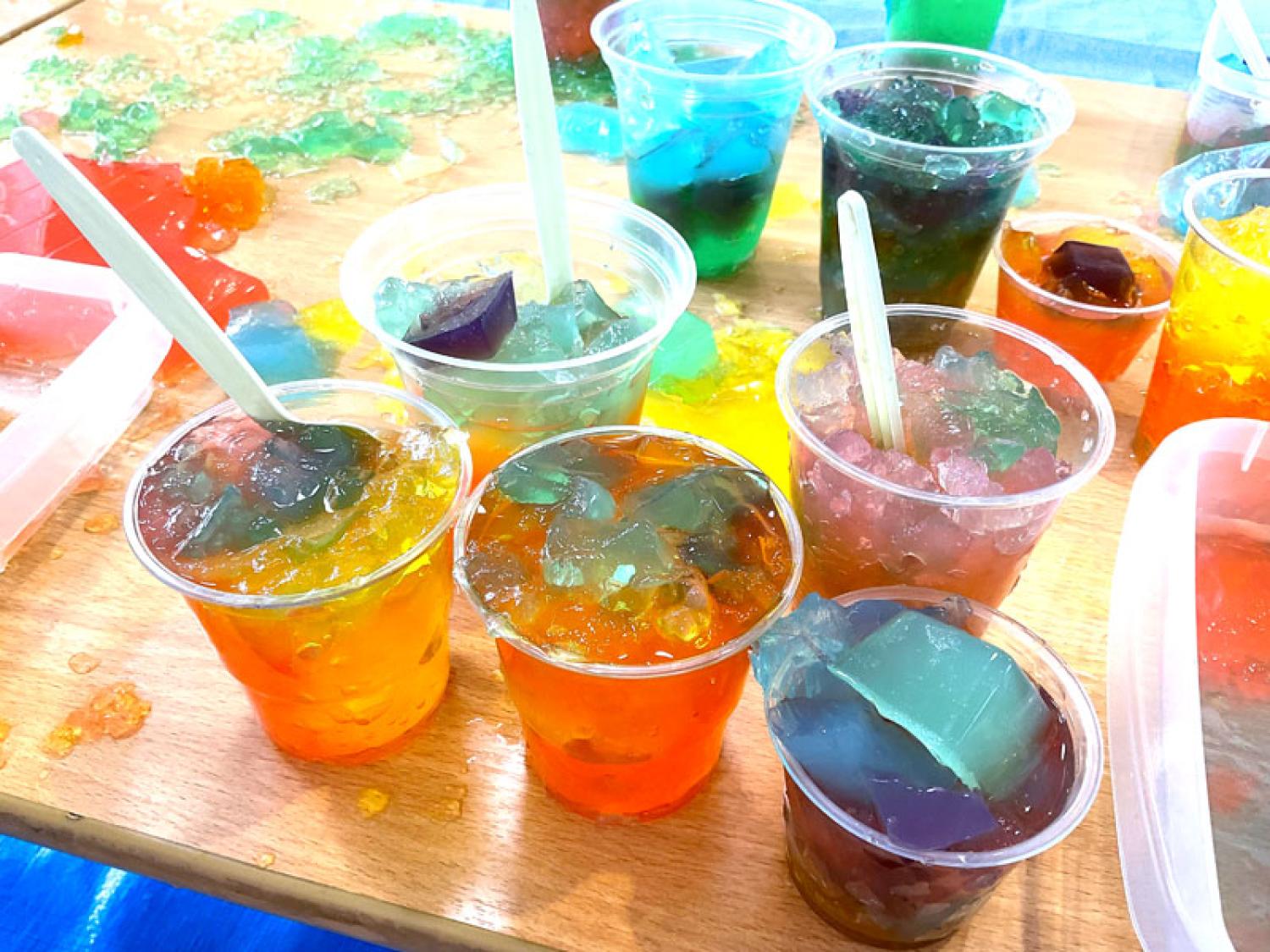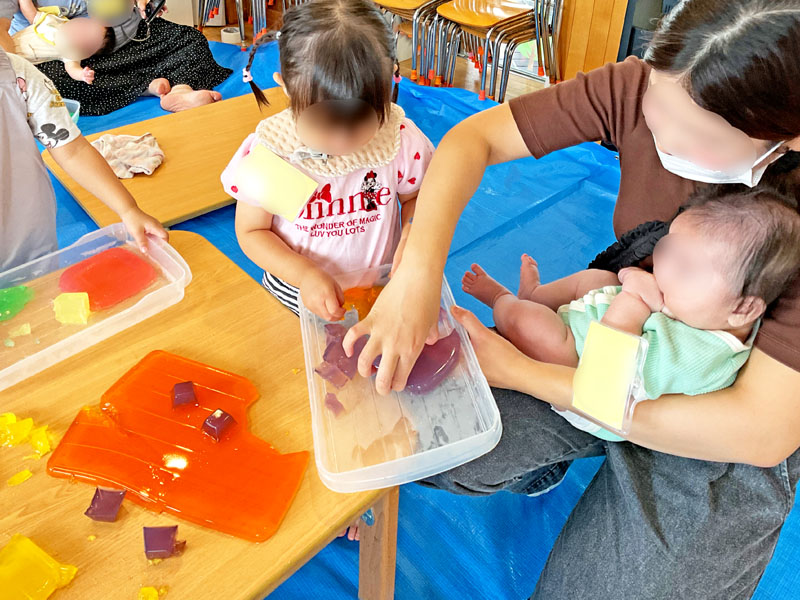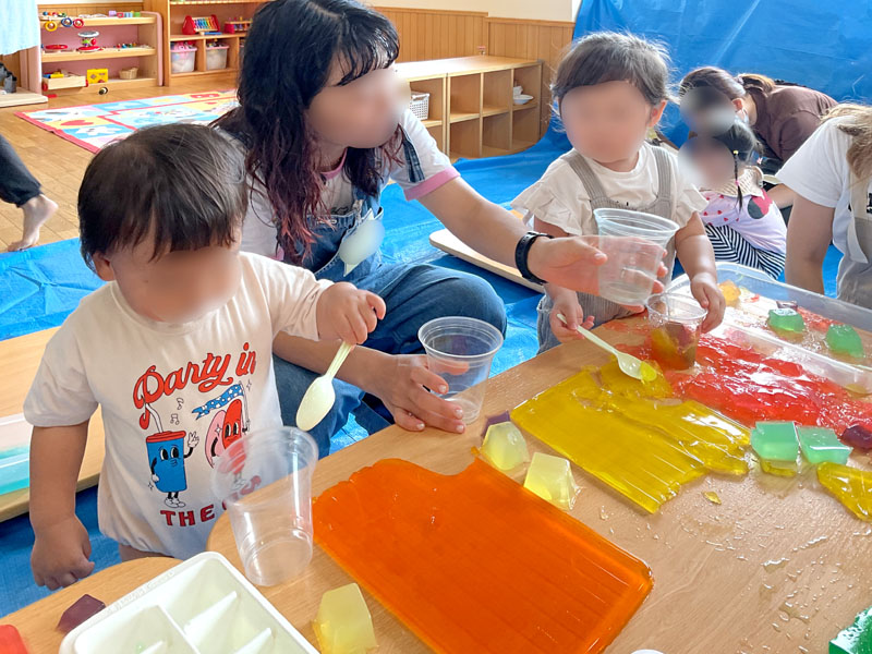 カラフルな色の寒天を用意し、感触を楽しみながら五感を刺激!