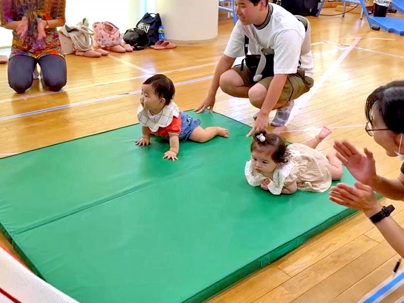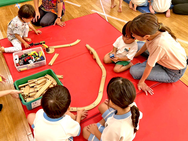 新福島ちどり保育園が毎月第2木曜日に実施している地域交流「いっしょにあそぼう」、今月は運動会目前ということで「運動会ごっこ」を行いました。今回は3歳児クラスの子どもたちが参加しましたが、まずは慣れるために一緒に玩具であそぶ時間を設けてから、そのあとに運動会で行う体操や「エビカニクス」を踊ったり、ハイハイ競走や魚とりゲームなどをしてみんなでたくさん体を動かしました。自分たちよりも小さなおともだちにあそびかたを教えてあげるなどお兄さん・お姉さんとして優しく接する姿も見られ、なかよく過ごすことができました。