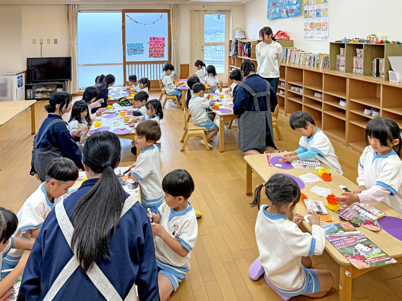 4歳児クラスの子ども達にハロウィンの絵本を読んでくれたり、その後はハロウィンにちなんだうちわ製作を一緒に楽しでくれました。