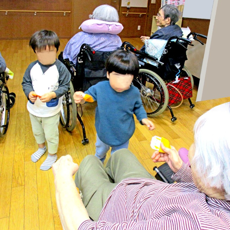 キッズから徒歩で行くことができる特別養護老人ホーム『萩の台ちどり』に2歳児4名がおじいちゃんやおばあちゃんに会いに出かけました。