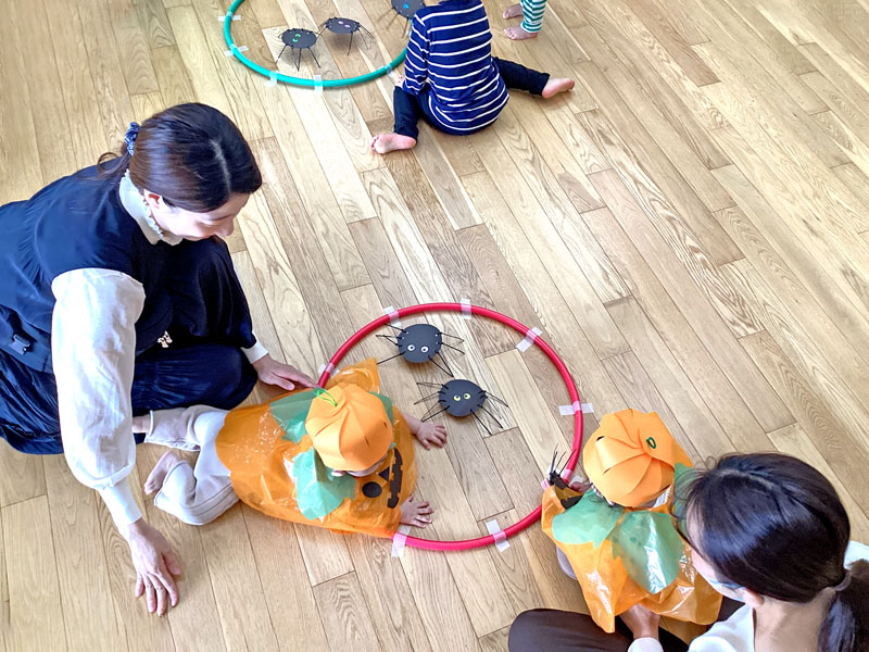ジャコランタンの帽子作りやおばけやクモの巣の的あて、大きなかぼちゃのボールなどの手作りおもちゃでたくさん身体を使って遊んで頂きました。