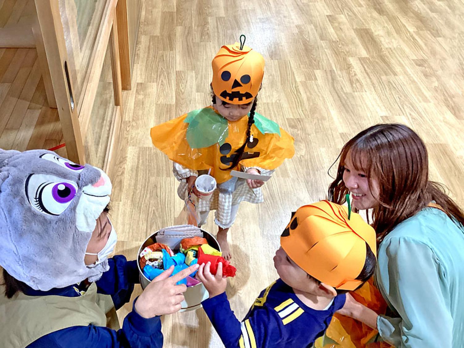 トトロやウサギに変装した職員から、キャンディや魔法のステッキをもらうとお子様も保護者様も素敵な笑顔でハロウィン気分を楽しんでおられました。