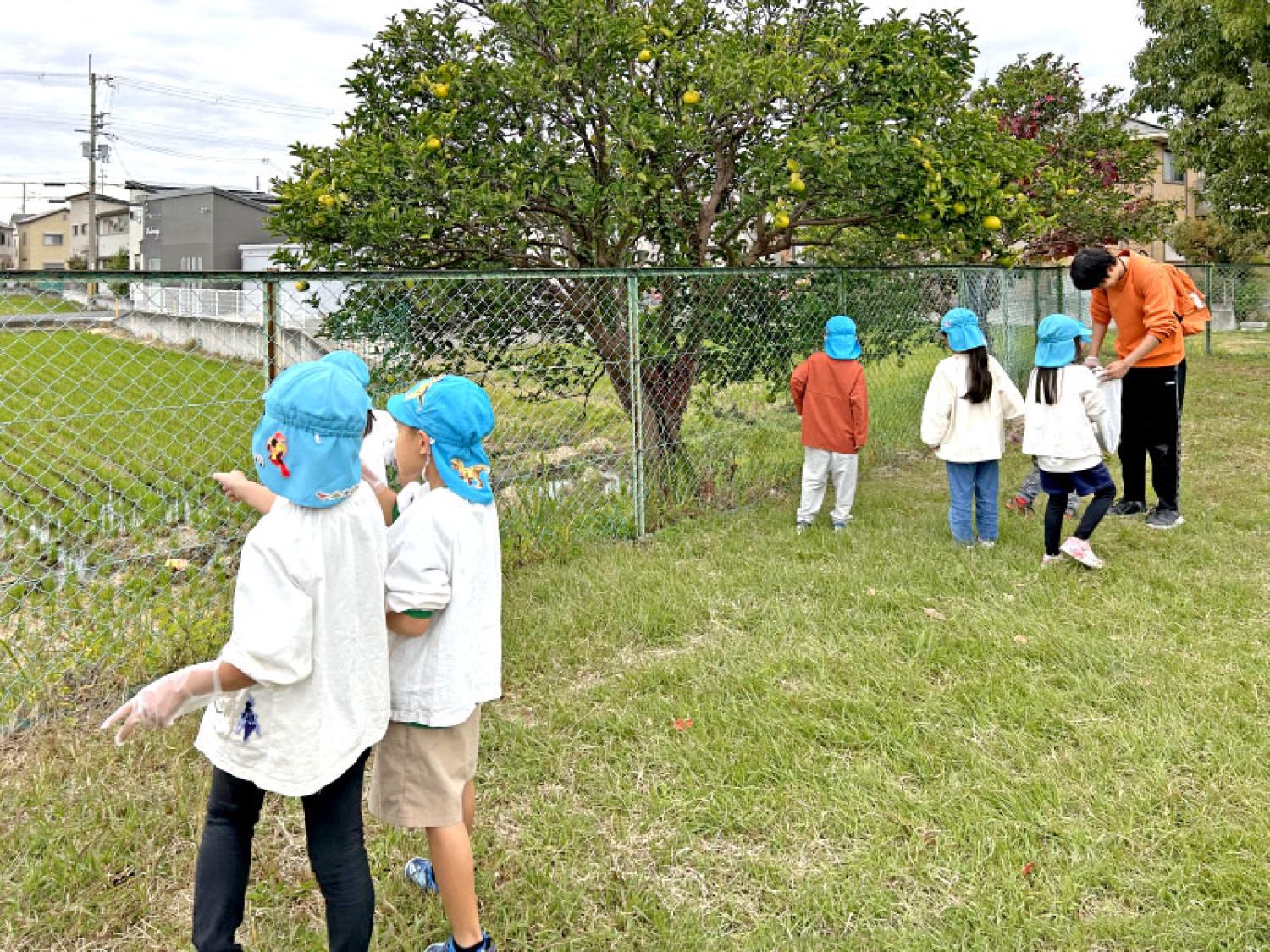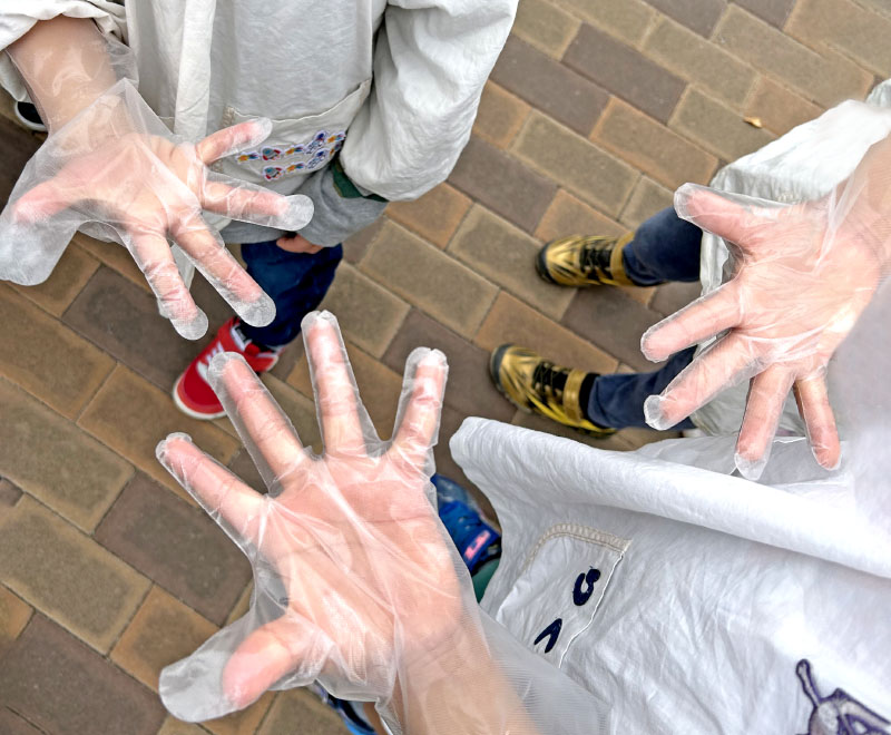 今回は、「公園にごみがたくさん落ちていたよ」と子どもたちが教えてくれたので、いちょうちびっこ広場に向かって清掃活動をしました。