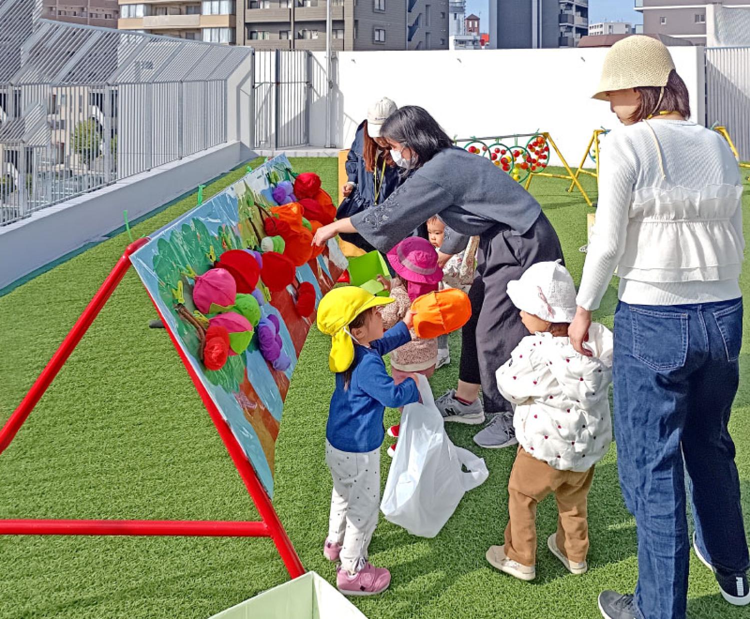 認定こども園東野田ちどり保育園で、毎月第二火曜日に行っている園庭開放「わっわっキッズ」を開催しました。 今回は未就園児3組の参加でした。 屋上園庭で「味覚狩りごっこ」を楽しみました。 秋晴れの中、親子で協力しながら色んな種類の果物やさつまいもを収穫して楽しみました。