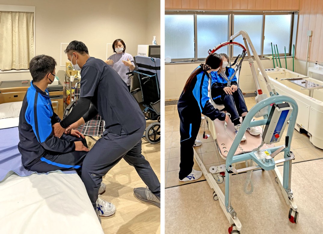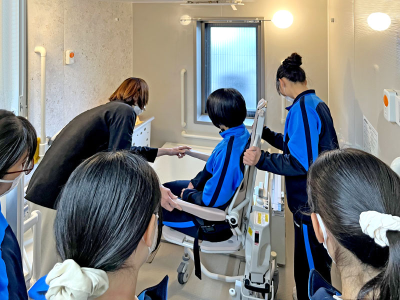 続く11月19日には「入浴介助」の授業として、入浴介助の目的や手順の学習に加え、機械浴の体験にも取り組んでいただきました。
