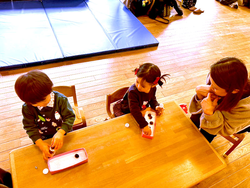 リピ-トしていただいているお子様が多かったので園の雰囲気にもすっかり慣れ、おともだち同士かかわりながら和やかな雰囲気のなか、最後には作ったマラカスで楽器あそびをしたりクリスマスツリ-の前で記念撮影をしたりして、楽しく過ごすことができました。
