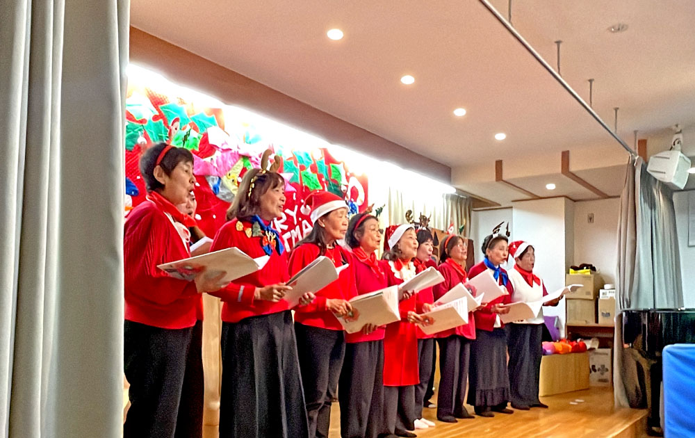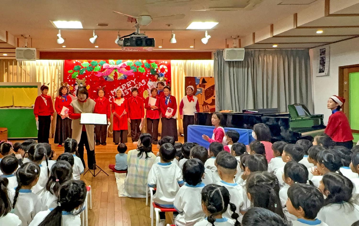 認定こども園 東野田ちどり保育園クリスマス会に、地域貢献活動として創立30年の地域のコーラス団「コールロゼ」13名の方々が来てくださりました。