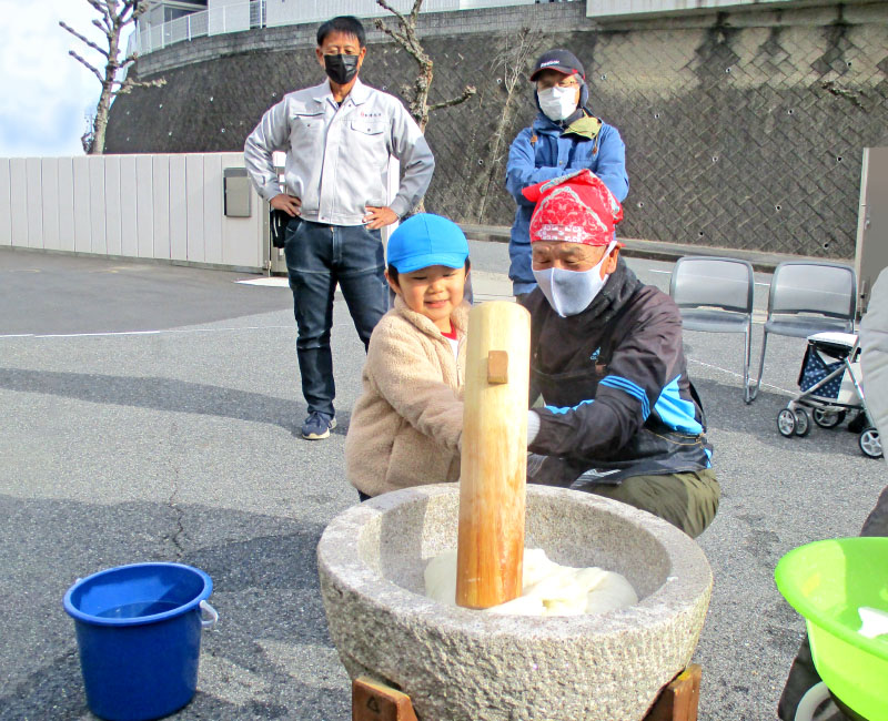 ぺったんぺったんと杵を持ってもちつきを楽しみ、あたたかいお餅をくるくると丸め「ふわふわや~」と大喜びでした。