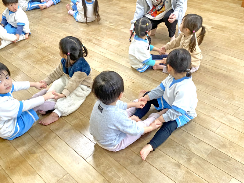 最初はみんなで輪になって、お名前を呼んで「は~い!」とお返事をしてお隣のお友だちに送っていくという遊びをしました。