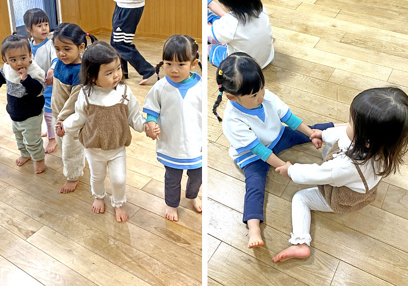 本園の2歳児クラスと遊戯室で1時間程度、交流会を行いました。