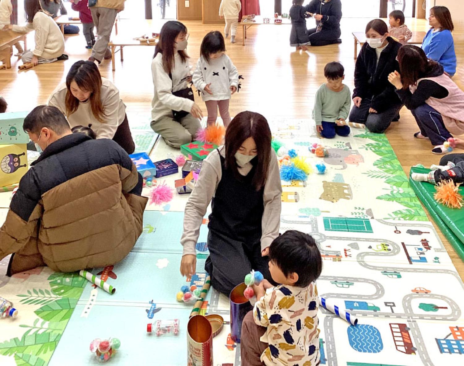 あまだのみやちどりこども園で、子育て支援の室内開放「音あそび」(ホール)を行い、今回も沢山の親子が遊びに来てくださいました。
