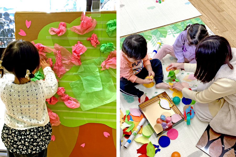 指先を使って、つまんだり・引っ張ったり・入れたり・出したり。色々なコーナーを回りながら好みの遊び方を見つけて、ぐっと集中して遊び込んでいる姿も可愛らしかったです