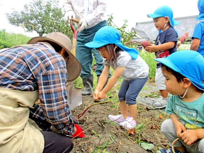 5月中旬に地域の方の畑にさつまいもの苗を植えに行かせていただいた子ども達。「お...