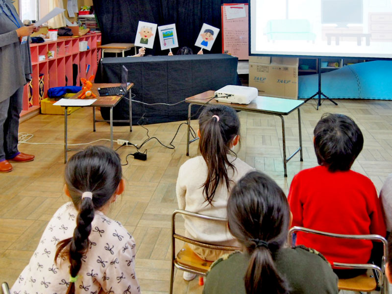 大正区社会協議会の方をお迎えし、5歳児のこども達が、「認知症キッズサポーター養成講座」を受講しました。はじめにロバ隊長のぬいぐるみが登場し、こども達の気持ちをほぐしてくれ、その後