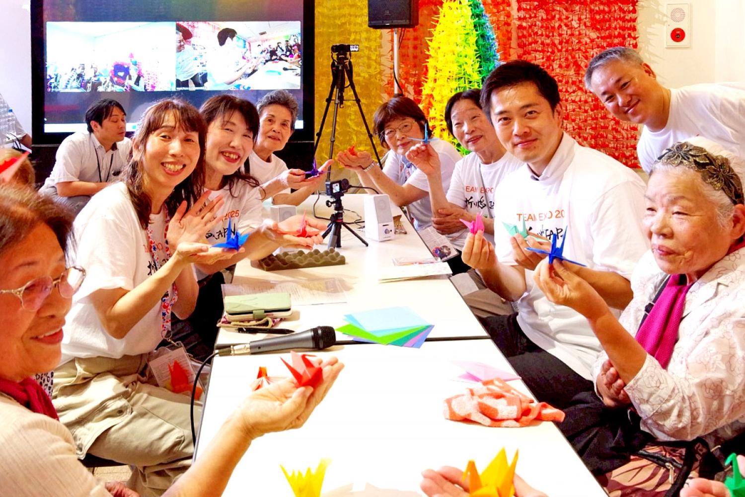 当法人も、ケアホームちどりおよびナーシングホーム智鳥で、地域住民や入居者の方々とともに、週1回程度「ゆめ伴(とも)サロン」を開催し、全国から寄せられた折り鶴の色分けや糸でつなぐ作業、折り鶴の作成などを行ってきました。それぞれが「自分にできること」に取り組みながら、地域との関わりや対話を大切にし、楽しく活動を進めました。完成した多くの折り鶴は、万博会場に展示され、多数の来場者の方々にご覧いただくことができました。