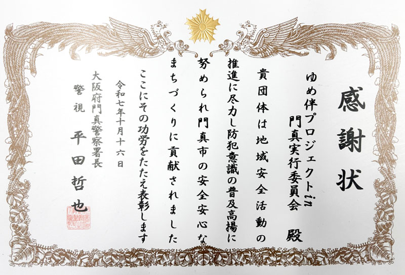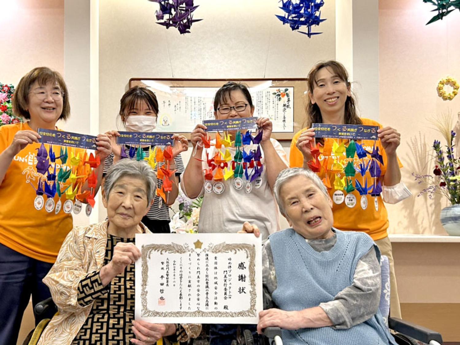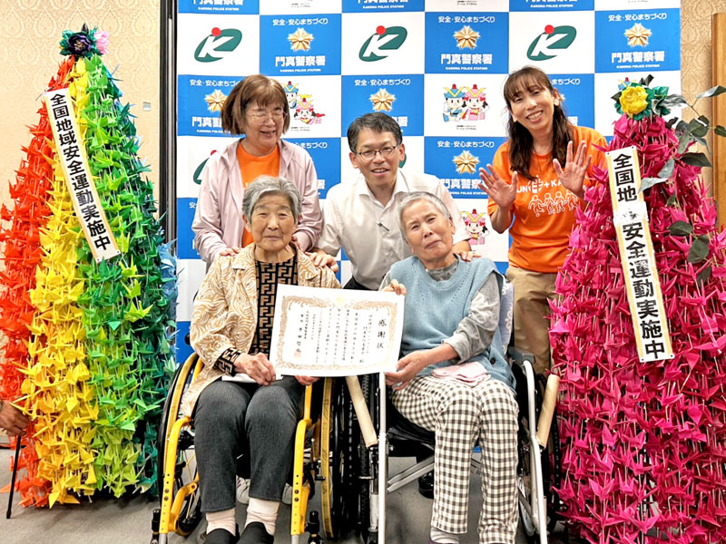このたび、ナーシングホーム智鳥で開催している「ゆめ伴サロン」において、詐欺被害防止を願い制作した折り鶴パネルや折り鶴ツリーの取り組みが評価され、門真警察署より感謝状をいただくこととなりました。