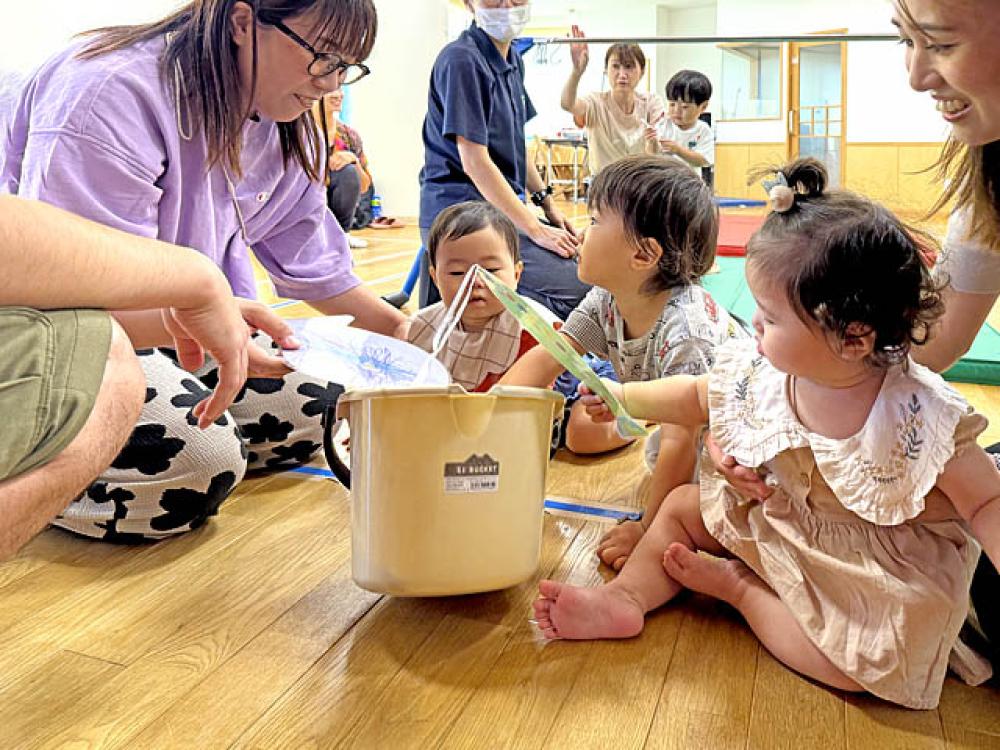 その後、運動会で行う「なんだかんだ」の体操や、「エビカニクス」を踊り、体を動かしました。かけっこ・ハイハイでは「よーいどん」のかけ声で友だちと一緒にゴールまで行くことができました。また、魚運びでは鉄棒にぶらさがった魚を上手にとり、バケツの中にいれることができて嬉しそうでした。